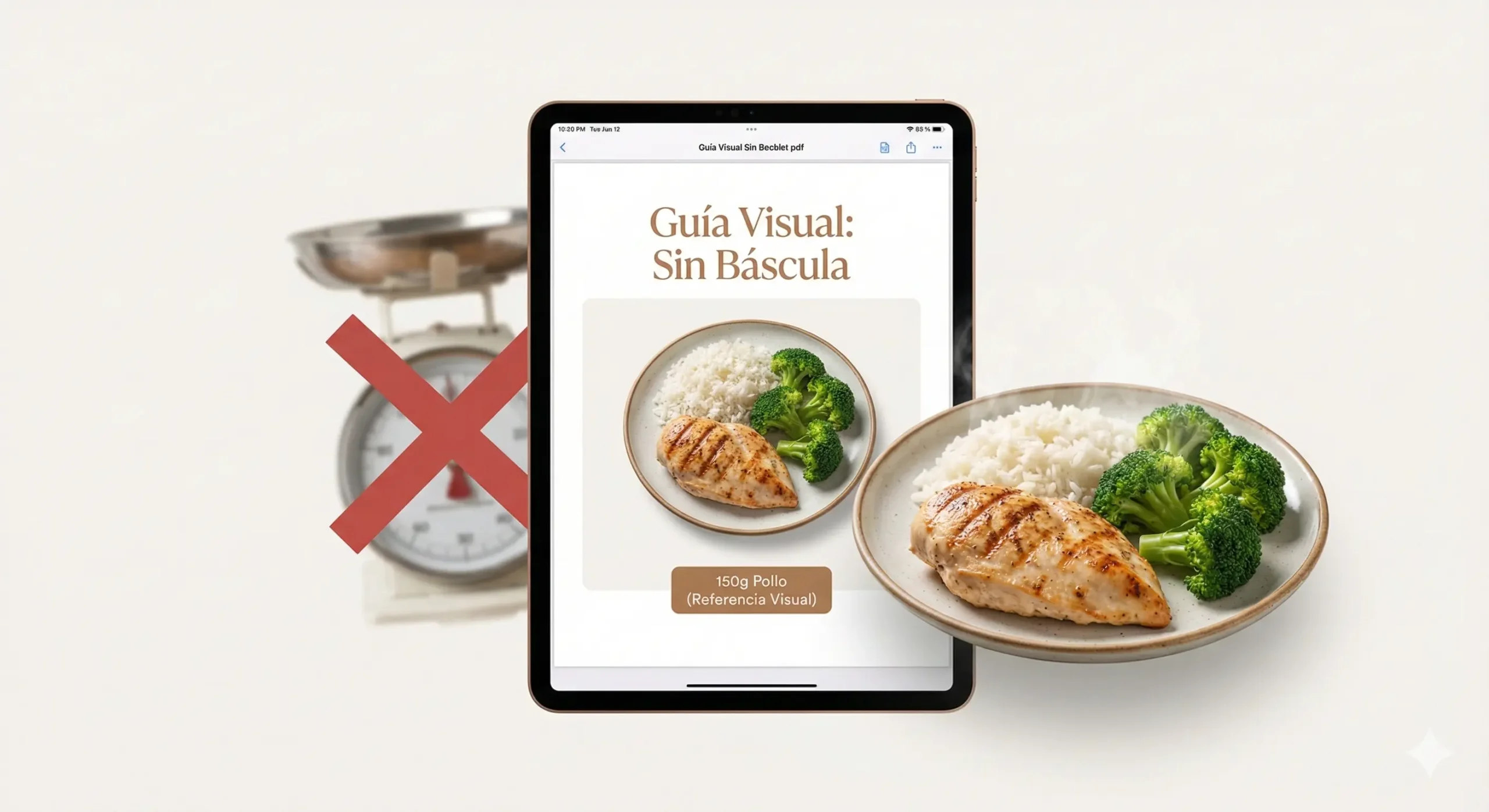 - Olvídate de contar calorías obsesivamente. Te enseño con fotos reales de referencia (ej: cómo se ven 150g de pollo) para que aprendas a comer intuitivamente, ya sea para ganar masa o perder grasa.