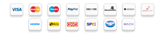 Dándo clic en el botón vas a ver nuestro «check-out» de pago ahí te apareceran todas las opciones de pago disponibles en tu moneda local, puedes usar tarjeta de credito, debito, transferencias, Paypal, entre otras.